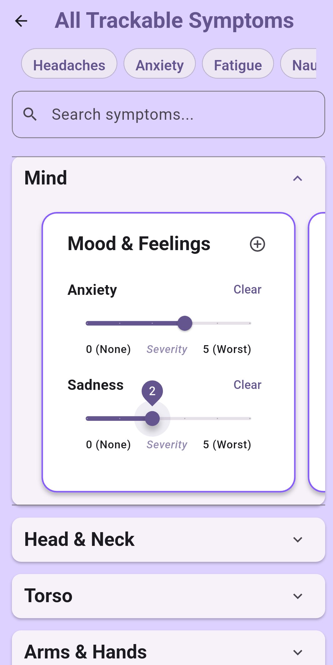 Choose symptom types and personalize your experience.